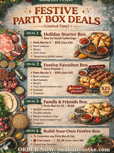 At Swahili Feast, we transform your celebration into an unforgettable experience by blending cultural authenticity, professionalism, and our deep passion for food. Let us infuse your event with the vibrant warmth and flavors of Swahili hospitality, creating cherished memories that you and your guests will treasure long after the last bite. Join us in celebrating togetherness and joy at your table!